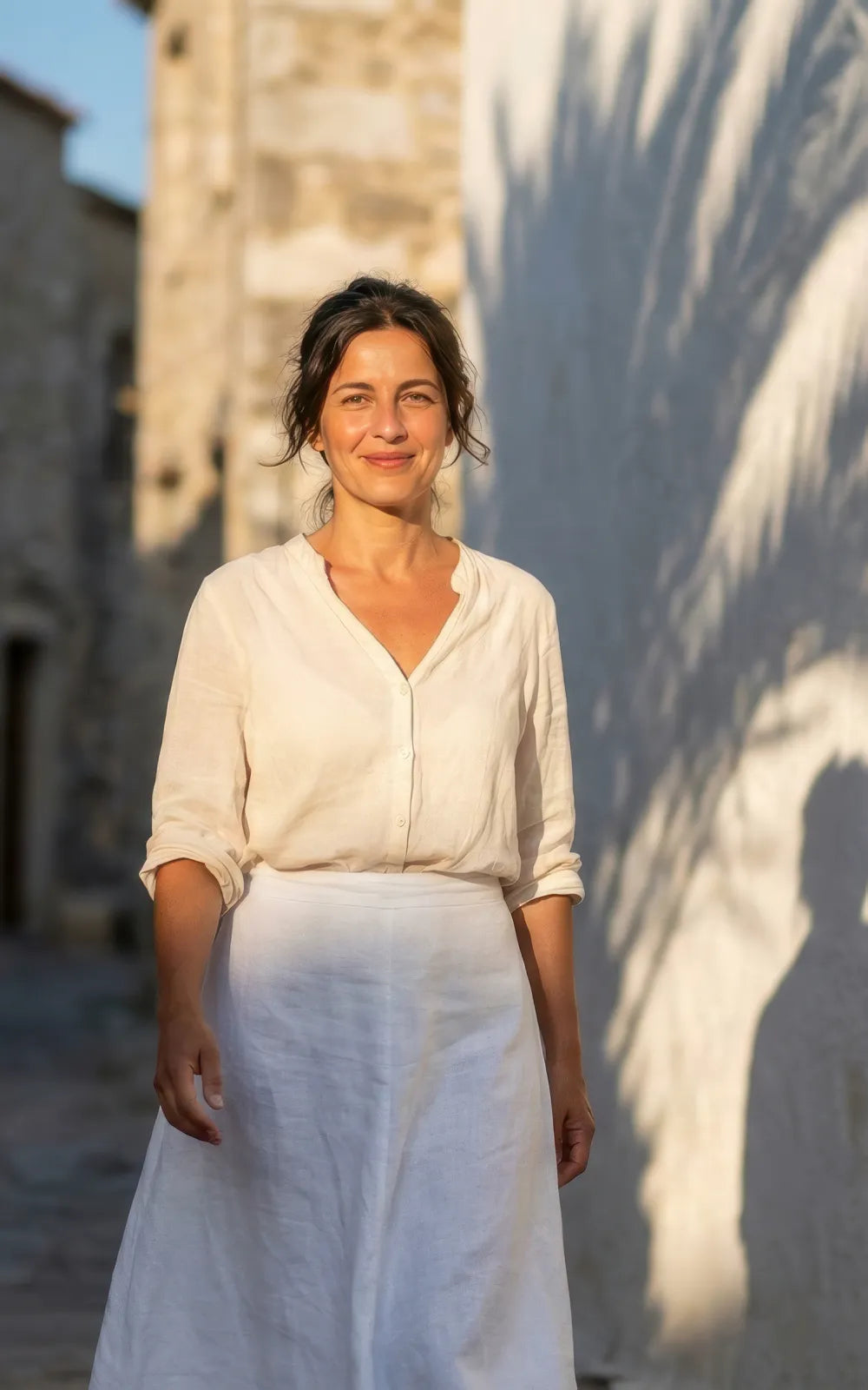 La douceur de vivre incarnée. Associée à des sandales en cuir naturel et un panier en osier, la jupe blanche longue devient l'emblème d'un chic solaire. Idéale pour les marchés d'été ou les balades en bord de mer.