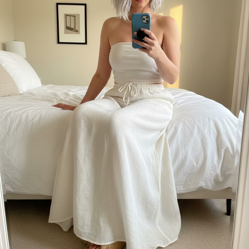 Cette jupe longue blanche incarne un minimalisme épuré qui valorise naturellement la silhouette. Sa coupe sirène dessine subtilement les hanches avant de s'élargir délicatement vers la base, créant une ligne fluide qui affine la taille et allonge la jambe. Le tissu doux au toucher velouté, légèrement extensible, épouse les formes sans contraindre. Sans fermeture visible, elle conserve un tombé lisse et élégant du haut jusqu'à l'ourlet discret. Facile à associer, elle se glisse avec aisance dans un vestiaire formel comme décontracté, du bureau aux soirées entre amis. Une présence confiante qui révèle une élégance spontanée à chaque occasion.